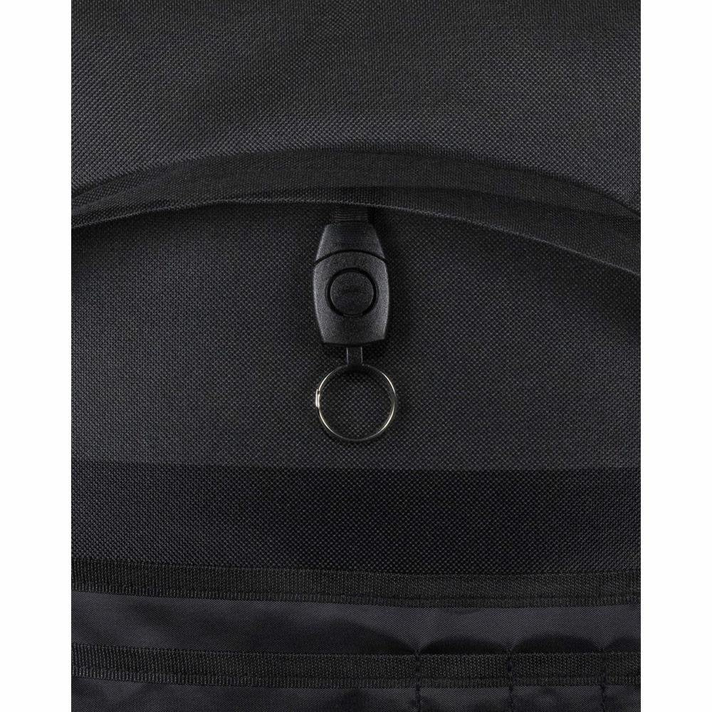 Screen printed graphic on front and side Dual zippered compartments Padded laptop sleeve with Velcro strap in back compartment Stationery organiser flap and hidden keyring in front compartment Water bottle...