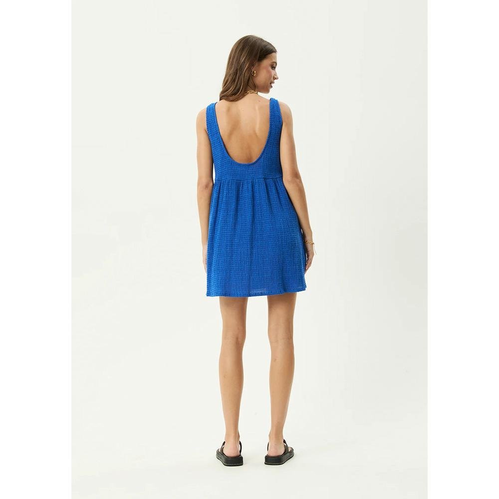Rouched mini dress with criss-cross back strap detail Sleeveless Adjustable Straps Elasticated Shirred Composition: 10% Linen / 20% Cotton / 70% Polyester Colour: RETRO BLUE