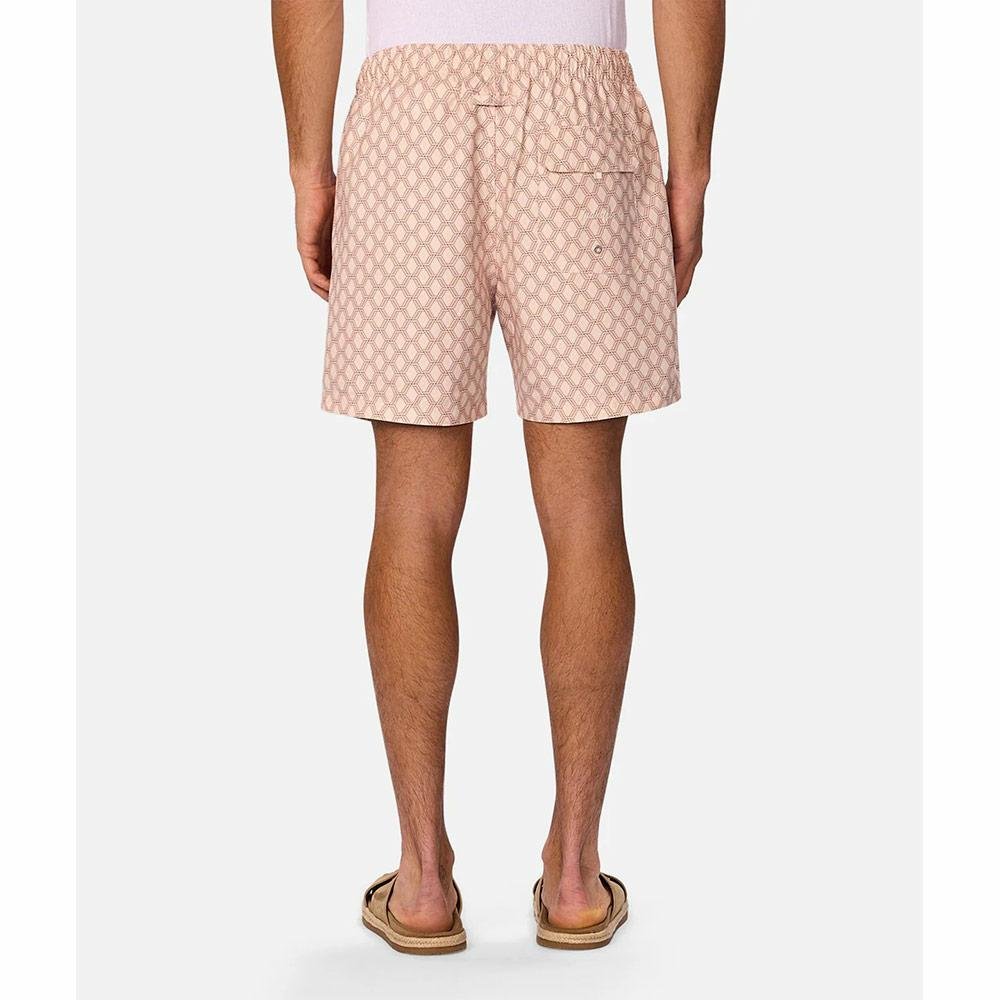 Above the knee fit Drawstring fastening Elasticated waist Patch closure back pocket Quick dry Side pockets Unique pattern Fabrication: 100% Polyester Colour: PEACH COMBO
