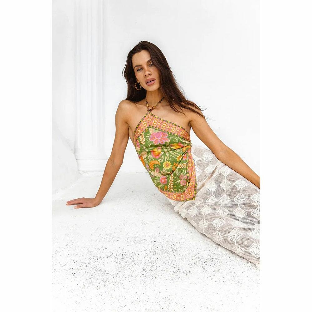 Introducing the beautifully detailed Rizz scarf top — a statement piece made from silky Tencel for an ultra-soft, summery feel. Featuring a halter neckline adorned with beads, detailed print placement,...