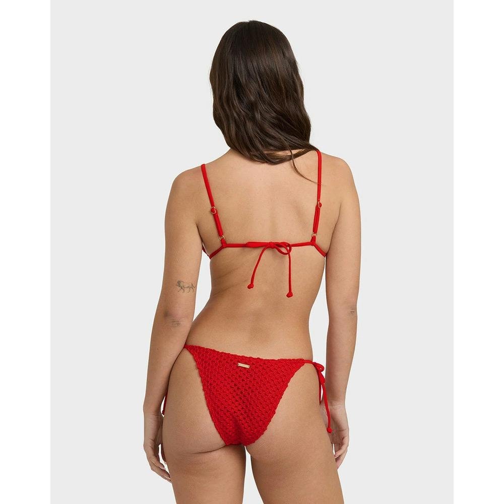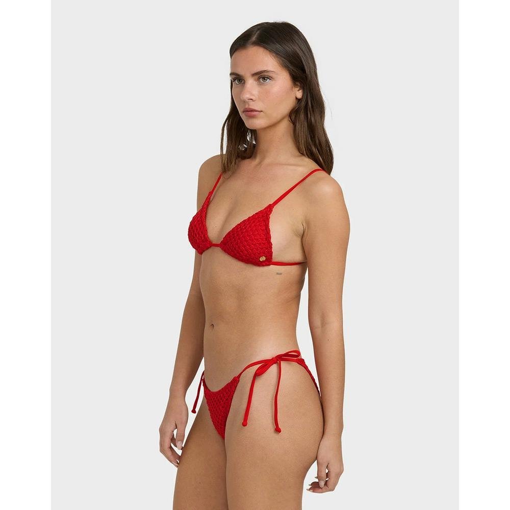 Mini tri top Very skimpy coverage Rings and sliders for adjustable straps Ties at centre back Circle metal plate detail Colour: RED ALOHA