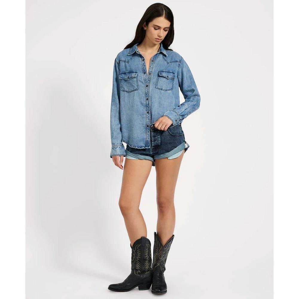 Oversized longline denim shirt Classic collar and full-length sleeves Press stud closure on front placket and cuffs Front patch pockets Relaxed western-inspired fit Lightweight and versatile 100 percent cotton BLUE...
