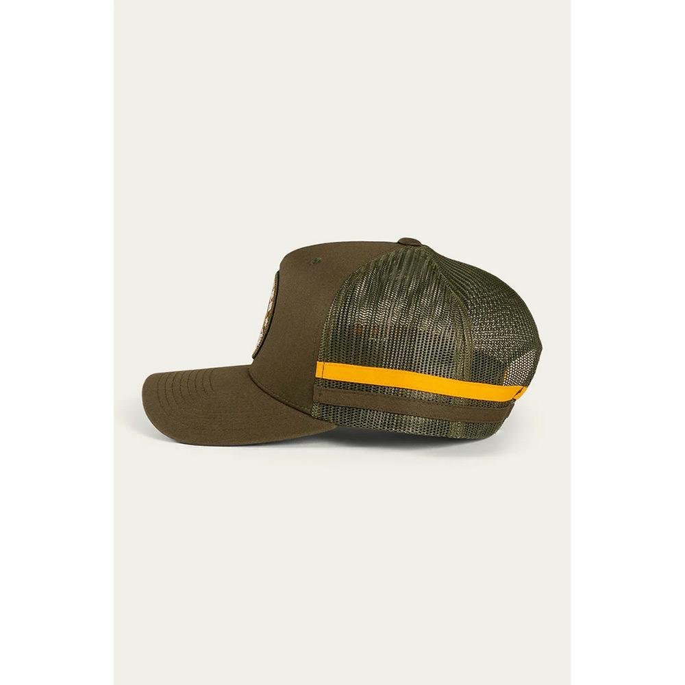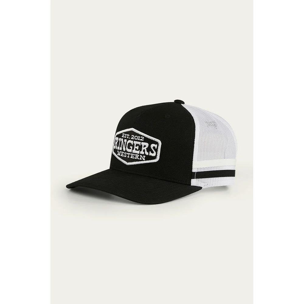 Cotton twill trucker cap with Ringers Western embroidered logo Mesh back panel Feature twin side stripes Embroidered logo patch Adjustable snapback closure Unisex design Ringers Western woven labels